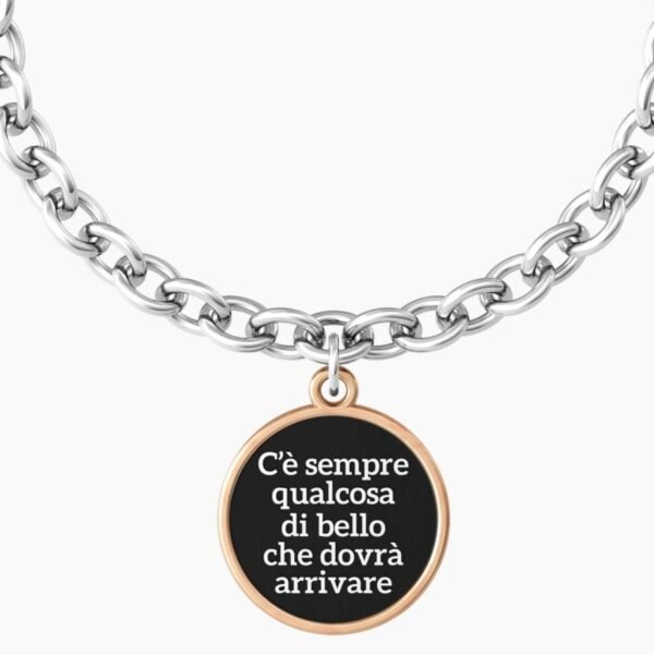 Scritta in rilievo e cristallo sul ciondolo satinato nero tondo con rifinitura color oro rosa e cristallo