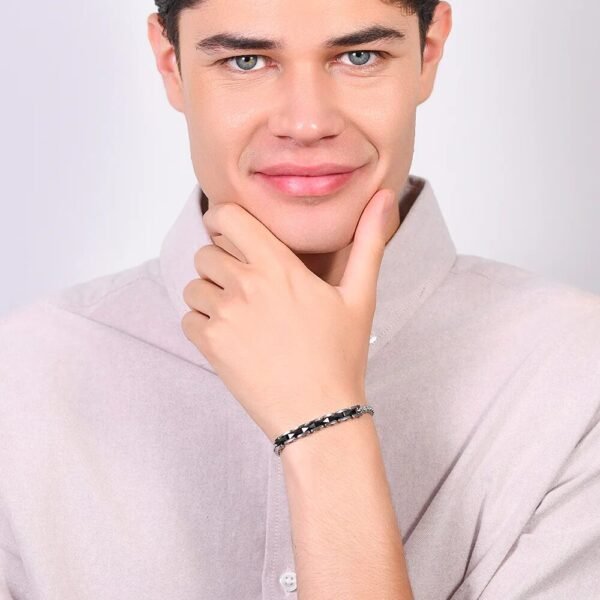 Gli elementi centrali in ceramica nera conferiscono al bracciale un tocco di eleganza minimalista, mentre la struttura in acciaio aggiunge una sensazione di solidità e raffinatezza. Questo bracciale per uomo offre una combinazione di durata e design contemporaneo.